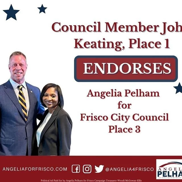 Interestingly, like his (alleged) under aged keg party throwing mayor, Keating also supported Angelia Pelham. Pelham is a left leaning former HR executive turned councilwoman for Frisco. She also previously worked at PepsiCo with Keating’s wife.