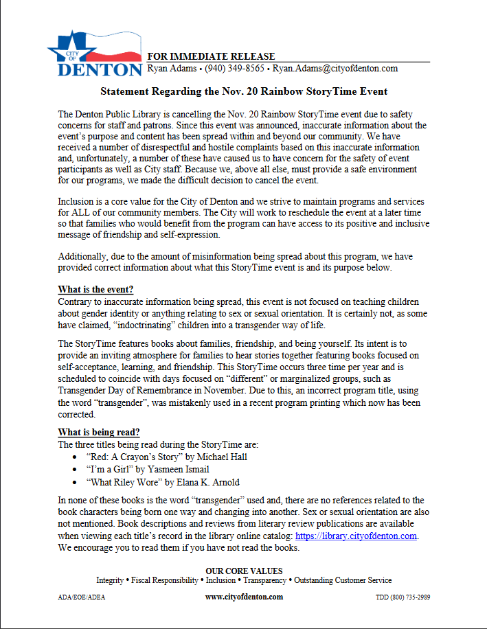 VICTORY - DENTON CHILD GROOMING STORYTIME CANCELLED DUE TO OUTCRY