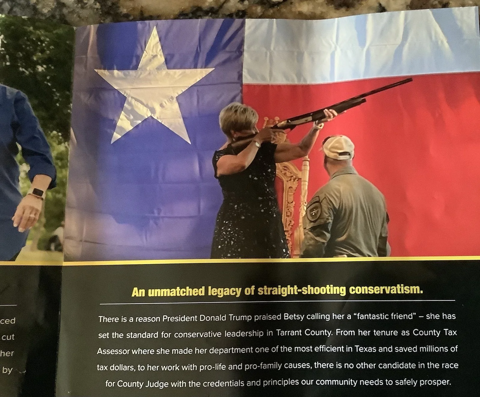 Betsy’s appears in the mailer under a photo with the most wrinkled flag in Texas. Some of the claims appear to brazen lies.